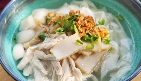 To serve: scald koay teow in hot water. Dish out and place required amount in serving bowls. Top up with shredded